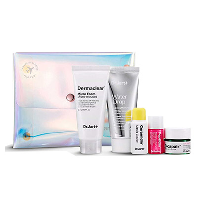 Dr.Jart+是来自韩国的药妆品牌,研发团队全部是皮肤科医生。这个旅行套装包括了神经酰胺爽肤水、修正泛红的绿色保湿水、泡沫洁面乳、水滴润肤露和肽素放射精油,一眼看过去全是医用名词。这个针对性极强的套装非常适合皮肤容易出问题的敏感肌小仙女,毕竟出门在外奔波劳累,反应在脸上就尴尬啦,各位护肤达人做好功课就可以入手啦。