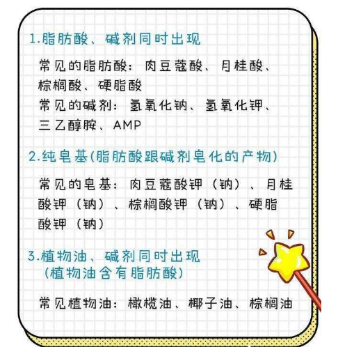 常见的皂基主要是脂肪酸类+碱类皂化形成的,常见的有酸:硬质酸、肉豆蔻酸、、月桂酸、棕榈酸、等等。很多手碱类物质:氢氧化钠、氢氧化钾、三乙醇胺。所以皂基的清洁力度很强,但一般对皮肤伤害也比较大,如果是油性皮肤会好点。