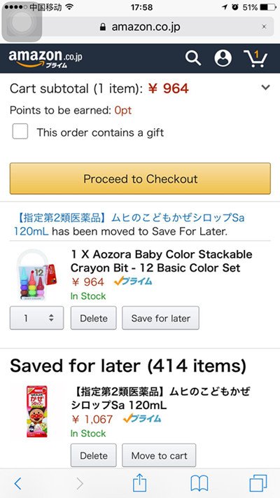 现日亚上该款蜡笔特价964日元,折合人民币约¥59,不含运费,日亚显示发货重量约为222g。非prime会员需凑单满2000日元才可免日本境内运费。