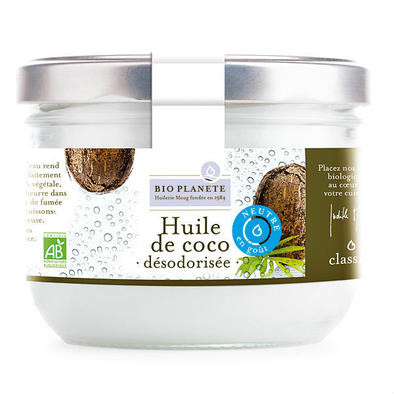 BioPlanète100%纯天然有机椰浆。以有机农业中的生物除臭法来祛除椰子味,先将其切碎成非常薄的切片,然后干燥。最后通过水蒸气的处理,让椰子油变成无臭、中性的味道。此款椰子油平均每100g含3404kj/828kacl,脂肪92克(包括饱和脂肪酸:85g),碳水化合物0克,糖0克,蛋白质0克,盐0克。100%天然有机,可替代您烘烤食品和烹饪中的黄油和食用油。脱臭椰子油具有高烟点,适合各种烹饪方式。