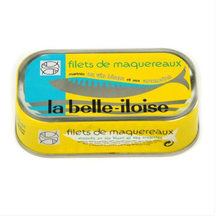 Conserverie La Belle Iloise 白葡萄酒特调鲭鱼配香料,此款鲭鱼罐头采用70%的鲭鱼脊肉、白葡萄酒 、白葡萄酒醋等9种香料手工秘制而成,口味香浓诱人。简单的香料,搭配出出奇诱人的口味。以布列塔尼的传统方式品尝此款罐头,搭配面包和黄油,更是能体现美味的正宗。