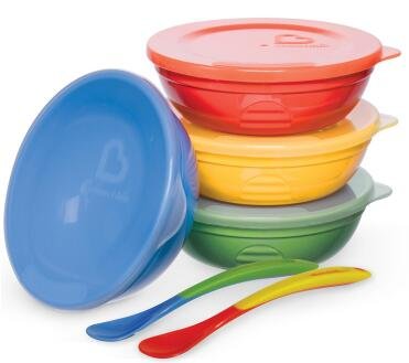 munchkin麦肯奇是美国婴幼儿餐具、玩具用品品牌,产品设计人性化又有趣有创意,受到父母和宝宝们的喜爱。10件套装包括:4个碗、4盖和2软勺。专为婴幼儿设计,选用优质环保材质,安全又健康,为了鼓励长大的宝宝开始熟悉饮水和让柔软的小舌头次感受到食物,从带吸管的杯子到断奶后的汤匙,帮助妈妈和宝宝享受每一步的经验。婴儿辅食碗造型可爱大方,同时方便宝宝舀取食物。防滑设计使餐盘重心稳固,即使敲打边缘也不会翻落。材质为硅胶,适用于4个月以上的婴幼儿。