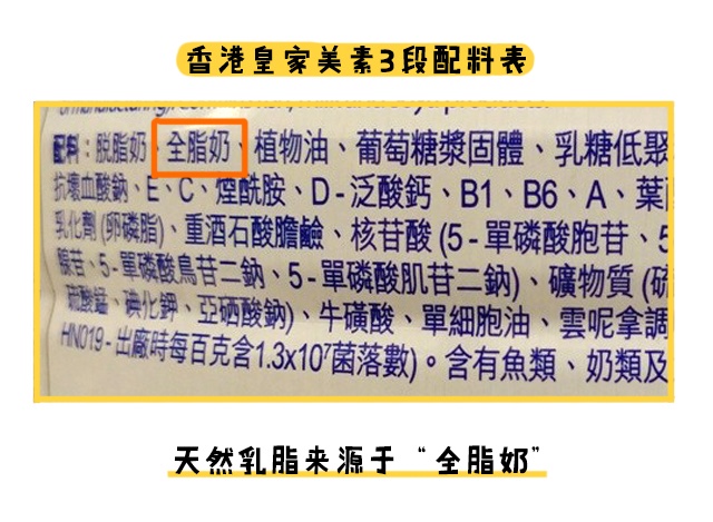 说完常规强化配方,接着我说说特色强化配方,这里说的特色强化配方指就是一些国标既没有硬性规定要添加,而市面上也比较少奶粉会添加的营养成分。香港皇家美素3个段数都添加了天然乳脂。