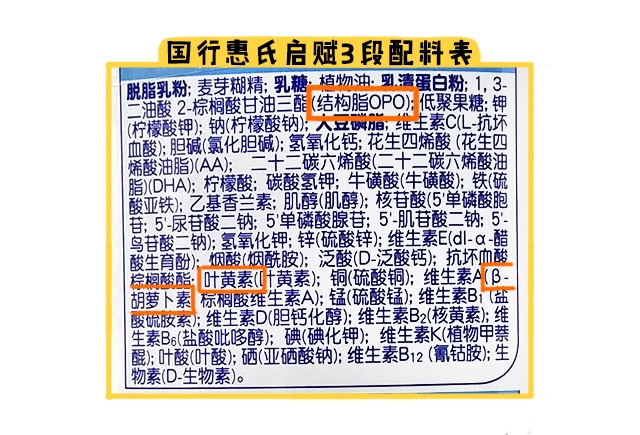 启赋和蓝臻一样是添加了3个特色强化配方,不过种类不同,启赋添加的是OPO,叶黄素和β-胡萝卜素。
