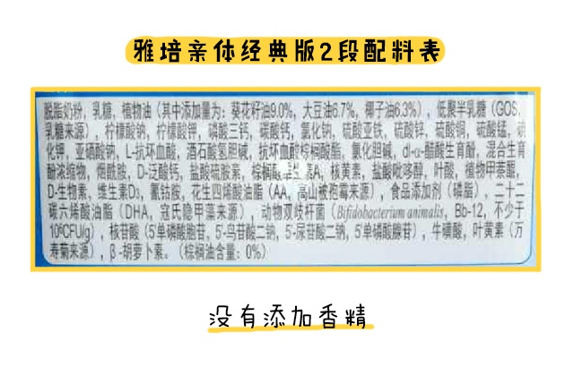 雅培奶粉很喜欢从2段就开始添加香精,不过其官方天猫旗舰店上宣传称,2017年版的亲体经典版“全线产品不使用香兰素”(香兰素是香精的一种)。