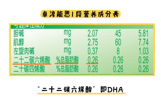 由表可见,在6项常规强化配方中,卓淳能恩1段就缺少了牛磺酸、胆碱和益生元3项,之后的2段和3段除了没有这3项之外,胆碱也没有再添加进去了。至于比较多妈妈关注的DHA添加量,由于营养成分表只是标注DHA占总脂肪酸的0.26%,所以具体含量是多少就不太明确。