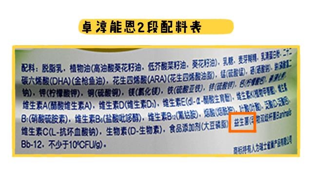 至于特色强化配方的种类也很少,特色强化配方是指国标既没有规定要添加,市面上比较少奶粉会添加的配方。卓淳能恩3个段数只加入了有助维持肠道菌群平衡和预防便秘的益生菌,而其他比较好的配方像OPO、乳铁蛋白、天然乳脂等都没有添加进去。
