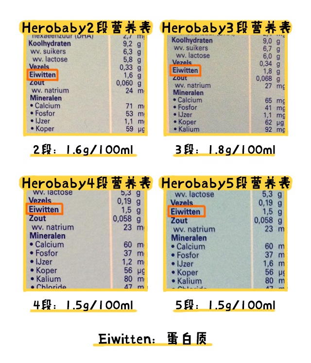 Hero baby2、3、4、5段的蛋白质含量,经过换算得出的结果均低于国标,添加量分别是0.55g/100kj 、0.62g/100kj 、0.57g/100kj和 0.57g/100kj,国标规定是 0.7-1.2g/100kj这个范围。(其中4段分为原味和草莓味两个版本,两个版本的蛋白质含量是一样的。)
