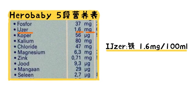 5段除了蛋白有不符合国标之外,1.6mg/100ml的铁含量换算成千焦为单位是0.60mg/100kj ,高于国标规定的0.50mg/100kj 。
