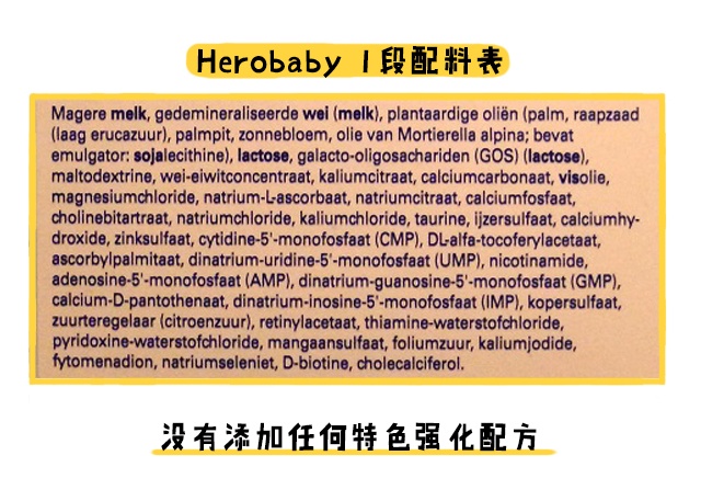 ero baby所属的瑞士玺乐集团是欧洲最主要的婴幼儿食品生产商之一,目前荷兰市场上的Hero baby奶粉,有纸盒包装普通版本和铁罐包装白金版两种,都在荷兰超市里出售。这篇要分析的是Hero baby普通版,下面我会详细说说这款奶粉的营养配方怎么样,好不好。