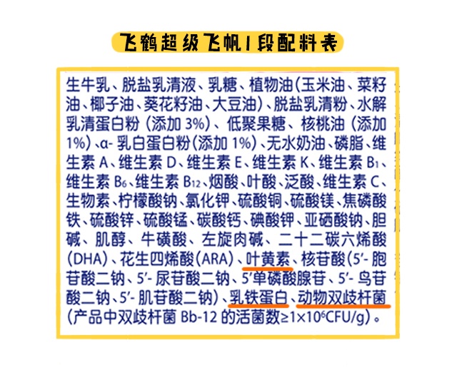 超级飞帆同样也添加了水解蛋白和叶黄素,不过它比星飞帆少添加了OPO和酪蛋白磷酸肽,但多添加了乳铁蛋白和益生菌(动物双歧杆菌)。