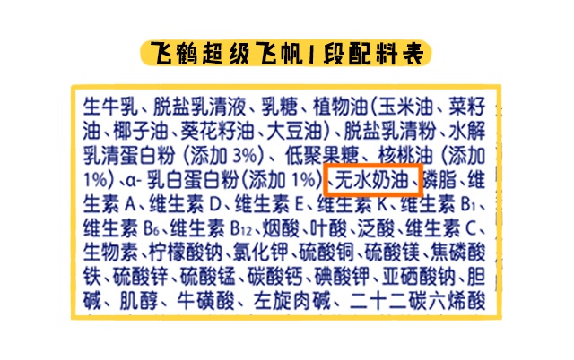 对比完奶源和营养,最后来看看原料方面,星飞帆和超级飞帆全段数都含有无水奶油,它其实不是什么有害物质,只不过它提取自牛乳,由于牛乳脂肪球的直径比较大,初生宝宝不是太好吸收,大家要留意一下,宝宝大一点就不用担心这个问题。