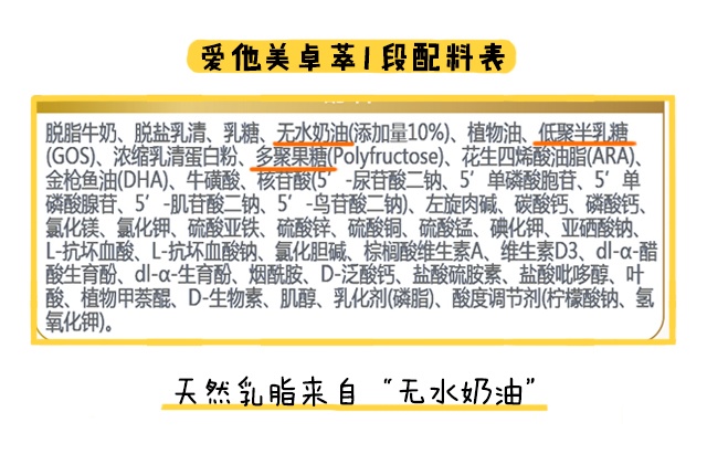 不过要留意一下,天然乳脂来源于牛乳,初生宝宝对牛乳脂肪不是那么好消化吸收,另一方面,天然乳脂还会使冲出来的奶粉带有明显的牛乳香气,假如宝宝比较偏爱母乳味道,或者之前一直吃口味比较清淡的奶粉,喝爱他美卓萃可能会有点抗拒。加上爱他美卓萃2段和4段掺有大包粉兑水的还原奶,使得新鲜度和营养保留度都有所下降。