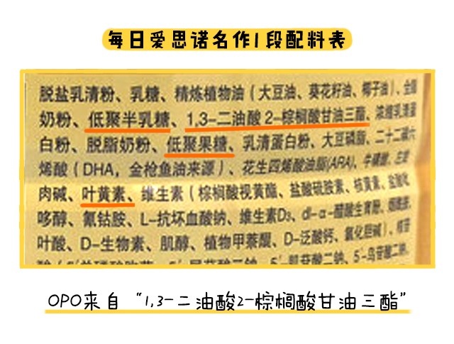 说完常规强化配方,接着说说特色强化配方,它指的是一些商家宣传自家奶粉特别添加进去的别人没有的营养素。每日爱思诺名作全部段数都添加了OPO、α-乳清蛋白、水解蛋白、益生元组合和叶黄素。