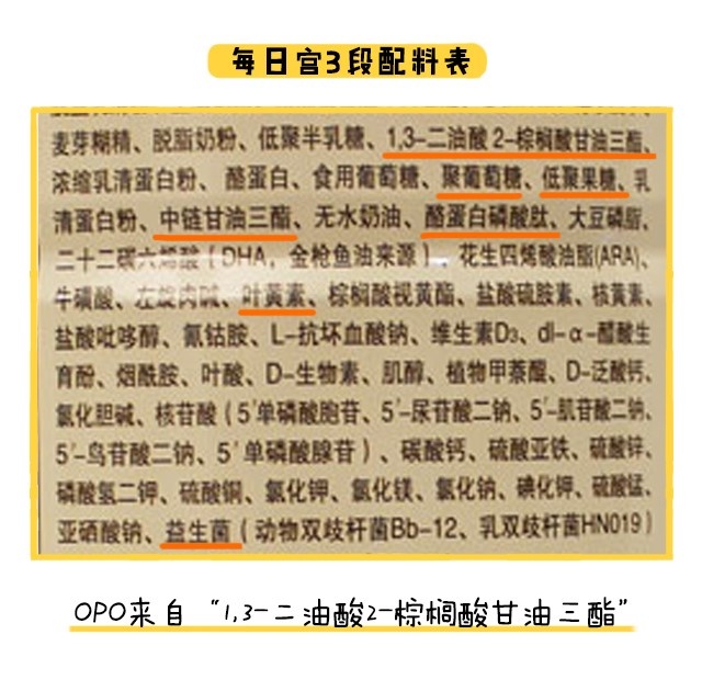 说完常规强化配方,接着还有特色强化配方,它指的是一些商家宣传自家奶粉特别添加进去的营养素。两款奶粉的特色强化配方都很丰富,每日宫是添加了OPO、中链甘油三酯、水解蛋白、酪蛋白磷酸肽、益生菌、益生元组合(聚葡萄糖就+低聚果糖)和叶黄素。
