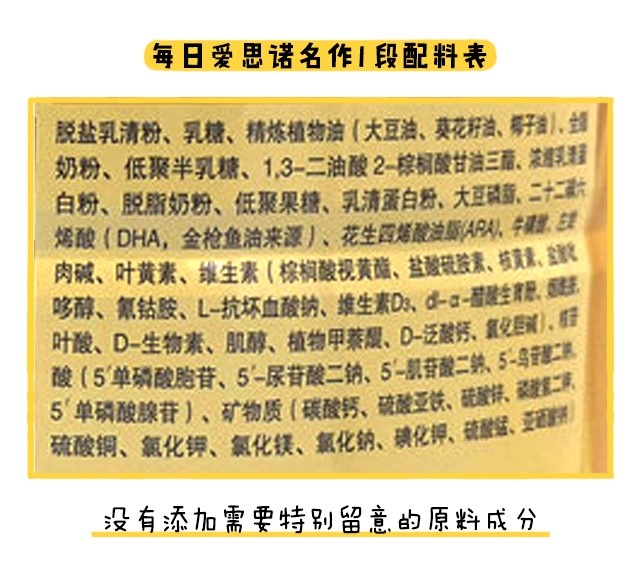 每日宫和每日爱思诺名作除了营养方面之外,原料这块也有明显区别。每日爱思诺名作表现比较好,各段数都没有添加需要特别留意的原料成分。