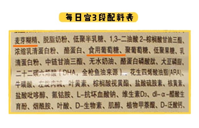 而每日宫全部段数都使用了麦芽糊精,2段之后还额外添加了食用葡萄糖。