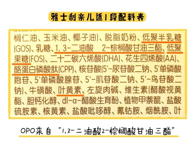 而亲儿适除了也有益生元组合(低聚半乳糖+低聚果糖)之外,各段数还添加了OPO、酪蛋白磷酸肽和叶黄素。