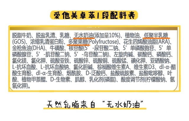 说完常规强化配方,接着说说特色强化配方,它指的是一些商家宣传自家奶粉特别添加进去的,区别于其他品牌的营养素。爱他美卓萃全部段数都添加了益生元组合(低聚半乳糖+低聚果糖)和天然乳脂。