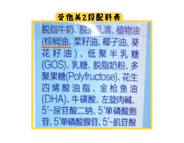 奶源和营养都说完了,最后是原料方面,大家要注意棕榈油的添加,棕榈油有两个坏处,一是会影响宝宝对钙的吸收,二是会使宝宝的大便变硬,增加便秘几率。好在爱他美所添加的益生元组合配方能一定程度上降低棕榈油的影响。