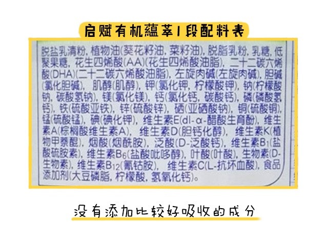 至于启赋有机蕰萃,它全部段数都没有添加比较利于宝宝吸收的成分。