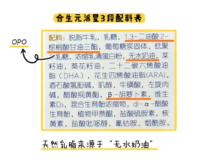 至于特色强化配方,它指的是一些商家宣传自家奶粉特别添加进去的,区别于其他品牌的营养素。派星各段数都添加了OPO、天然乳脂和α-乳清蛋白,2段之后还加入一个β-胡萝卜素。