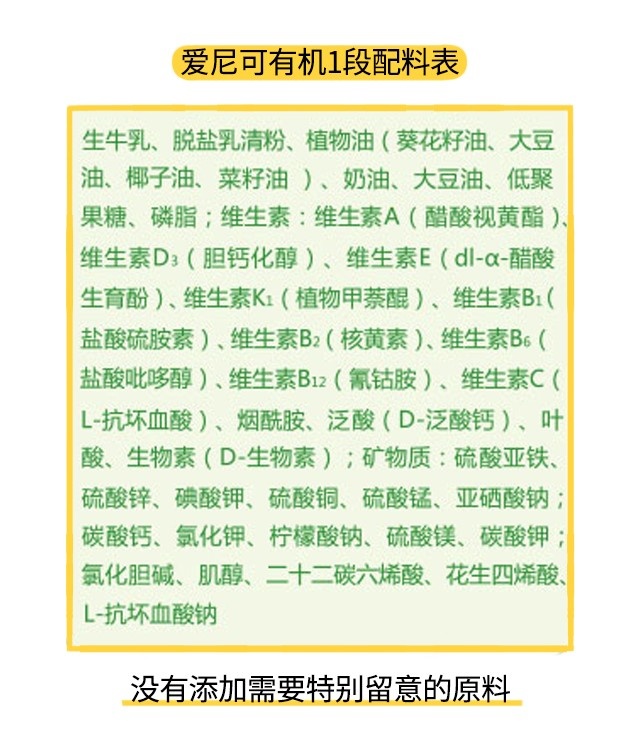 爱尼可拥有“有机认证”,与普通奶粉相比,有机奶对其生产原料及环境有着更严苛的要求,因此奶粉在安全性方面更加有保障。不过爱尼可有机只有1段是使用鲜奶生产,2段之后掺入了大包粉兑水的还原奶,还原奶经过反复加工,受到二次污染的几率比鲜奶高,而且加工过程中流失的营养素都比鲜奶多。