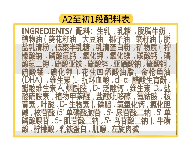 从配料表可以来看,A2至初全部段数都没有添加像OPO、天然乳脂等这些能一定程度上预防或改善宝宝便秘的成分。