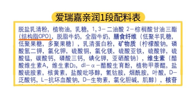 从配料表来看,亲润各段数都添加了OPO,OPO是一种植物油油脂,通过生物科技的改变,其大部分脂肪酸结构都与母乳一样是呈现OPO结构,可以有效减少钙皂的生成,促进宝宝对钙和脂肪酸的吸收。