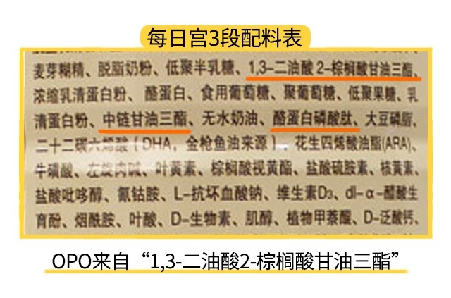 那么说回奶粉本身,每日宫各段数添加了若干个比较利于宝宝吸收的成分,分别是OPO、酪蛋白磷酸肽、水解蛋白和中链甘油三酯。