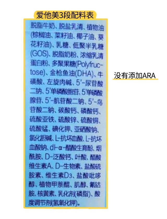 我翻阅了爱他美各个段数的配料表,这款奶粉3段和4段都没有添加ARA,一般在我的奶粉评测文章中都会提到6项常规强化配方,常规强化配方指的是一些国标没有规定必须要添加,但基本上每款普通奶粉都会有的营养素,所以我归类为常规强化配方,ARA就是6个常规强化配方之一,它可以促进宝宝大脑神经系统的发育,有助提高思维和记忆力。