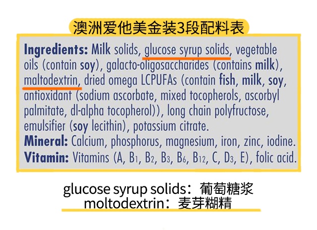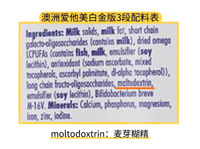 此外,两款奶粉3段均添加了麦芽糊精,而普通版还比白金版多添加了葡萄糖浆。