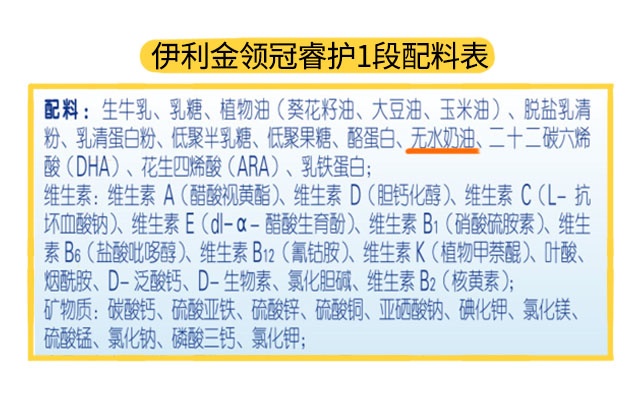 奶源和营养都对比完了,最后是原料这块。珍护和睿护均添加了无水奶油,无水奶油在奶粉中可以丰富脂肪酸的种类,但它来源于牛乳,牛乳脂肪不利于小月龄宝宝的消化吸收。