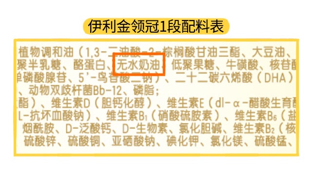 奶源和营养配方都说完了,最后是原料这块,大家要注意一下金领冠添加有无水奶油,无水奶油加在奶粉中虽然可以丰富脂肪酸的种类,但由于它来源于牛乳,牛乳脂肪球对于小月龄宝宝来说可能比较难消化吸收。