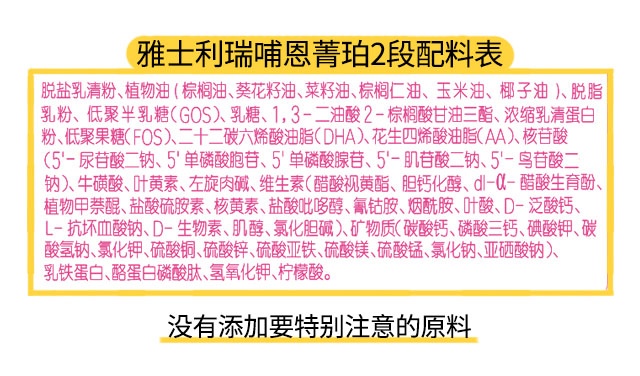 奶源和营养配方都说完了,最后是原料方面,瑞哺恩菁珀各段数都没有添加需要大家特别要留意的成分。