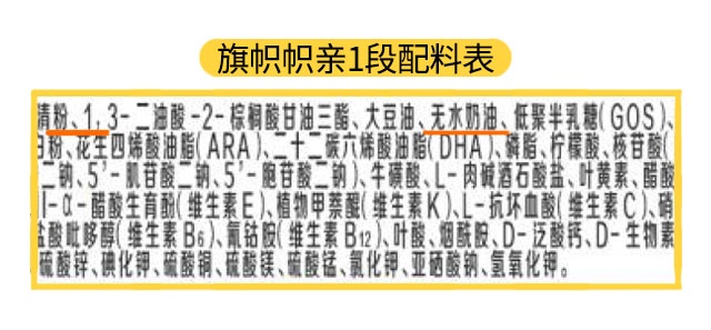 至于特色强化配方,它指的是一些商家宣传自家奶粉特别添加进去的,区别于其他品牌的营养素。旗帜帜亲各段数是添加了叶黄素、益生元组合(低聚半乳糖+低聚果糖)、OPO、少量水解蛋白。