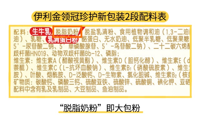 好了,以上就是伊利金领冠珍护奶粉新旧包装在奶源、营养、原料方面的区别,总的来说,新包装的“升级”主要在于奶源和营养两方面,从以前的全部段数还原奶生产,升级为1段鲜奶,2段之后掺还原奶,营养配方比旧包装多添加了MFGM乳脂球膜、乳源唾液酸这2个特色强化配方,在宝宝大脑发育、认知能力等方面起到积极作用。