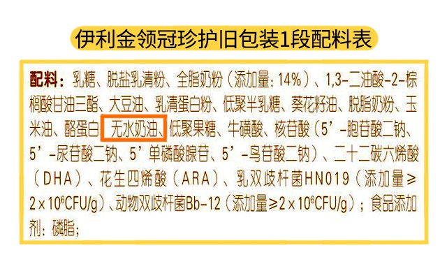 奶源和营养配方都说完了,最后是原料这块,珍护新旧包装的的添加情况很一致,均是含有无水奶油,无水奶油的添加虽然可以丰富奶粉的脂肪酸种类,但由于它来源于牛乳,牛乳脂肪球的直径比较大,对于小月龄宝宝来说可能会比较难消化吸收,大家要注意一下,等宝宝月龄大一些我们就不用担心这个问题。