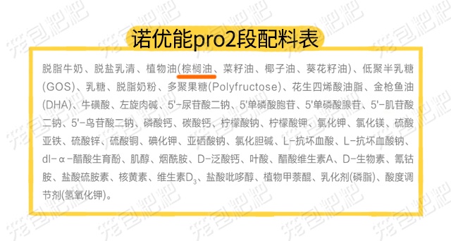 诺优能pro 2段在配料表中标注了所使用植物油的具体种类,分别是:棕榈油、菜籽油、椰子油、葵花籽油,其中棕榈油这个成分要注意,棕榈油的棕榈酸容易与钙结合形成钙皂,会影响宝宝对钙的吸收,而且会增加便便的硬度,从而增加宝宝便秘的几率。