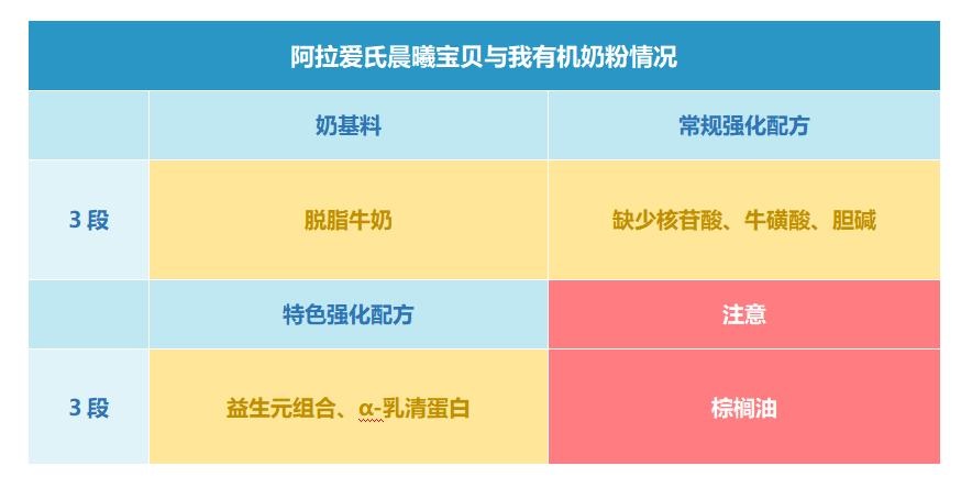 以下表格是阿拉爱氏晨曦宝贝与我有机3段奶粉配方中的特色成分和注意成分。