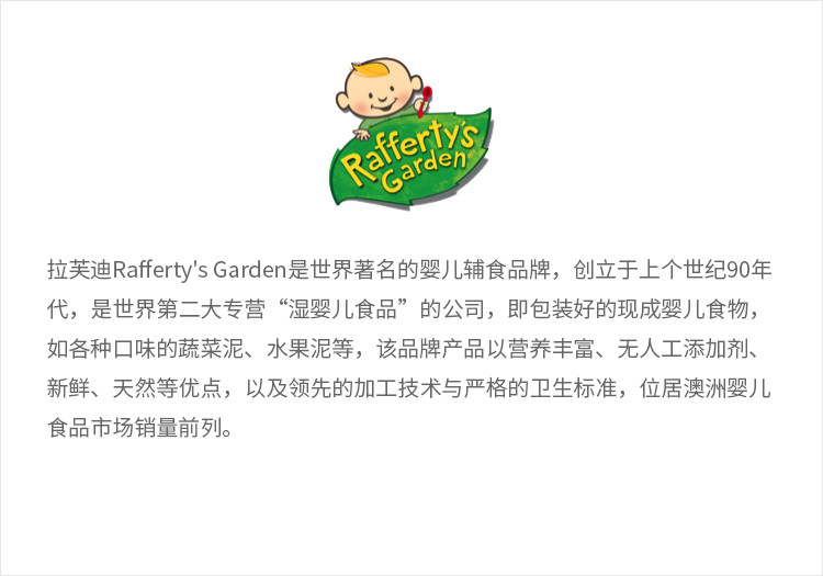 - 中文名称 :Rafferty's Garden 拉芙迪 蓝莓香蕉苹果果泥 4个月+ 120克