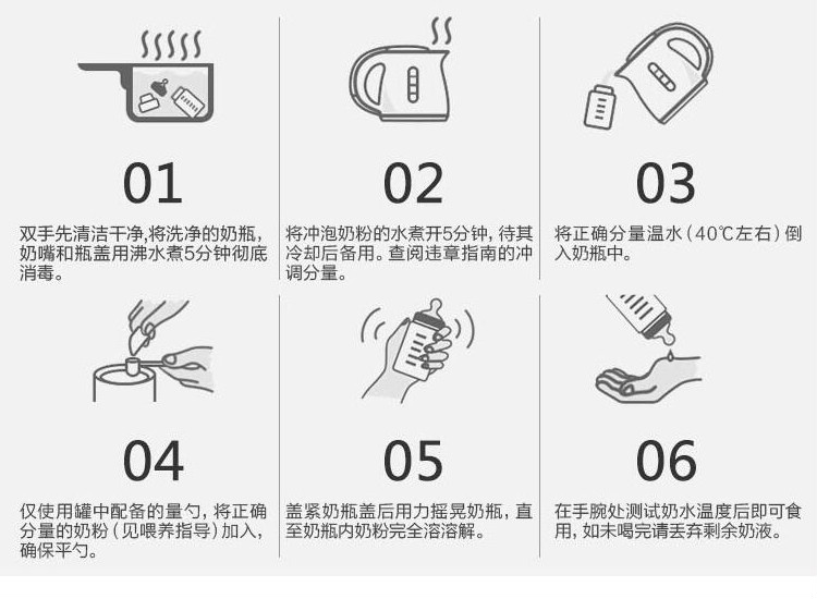 将正确量煮开过的凉水倒入奶瓶,加热到喂养温度;将每勺奶粉用内置的刮平器刮平;一平勺奶粉请兑50毫升水,盖好奶瓶盖,摇动奶瓶至奶粉完全溶解;喂养前,把奶液滴在手腕上试温,冲调好马上喂养(不要贮存),喂完后多余奶液请丢弃。