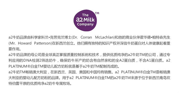 A2 白金系列婴幼儿配方奶粉(4段):经过三年的研究,专门为3岁以上婴儿定制营养均衡的奶粉配方。它特殊含有天然香草味,更加受孩子的喜爱。相比普通牛奶,A2白金婴幼儿配方奶粉4段专门为蹒跚学步的孩子量身定做。