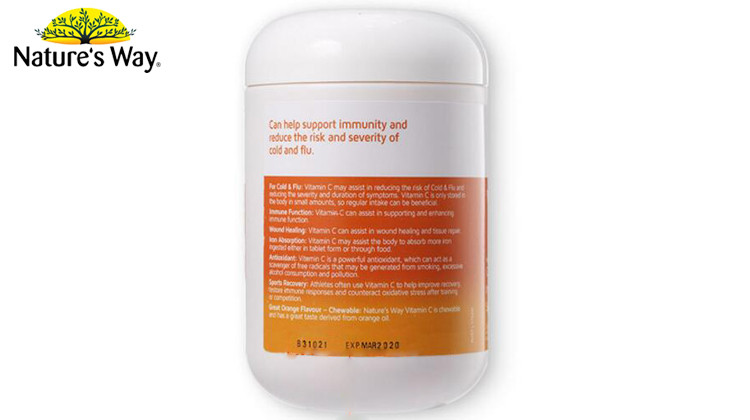 Nature's Way 佳思敏 500mg维生素C片(桔子味)富含维他命C,可帮助预防感冒及流感,减少症状持续时间及症状程度,经常服用维他命C含片还可帮助预防感冒及流感。