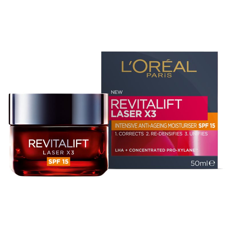 L Oreal Paris Revitalift Laser X3 抗衰老日间保湿霜 SPF15是一种功能强大的抗衰老保湿霜,加入抗衰老成份Pro-Xylane玻色因,这个玻色因是欧家专利的抗老成分,同样含有高浓度玻色因的就是赫莲娜的黑绷带了!!它能激活肌肤、紧致毛孔、修正细纹,令肌肤紧致有弹性 。