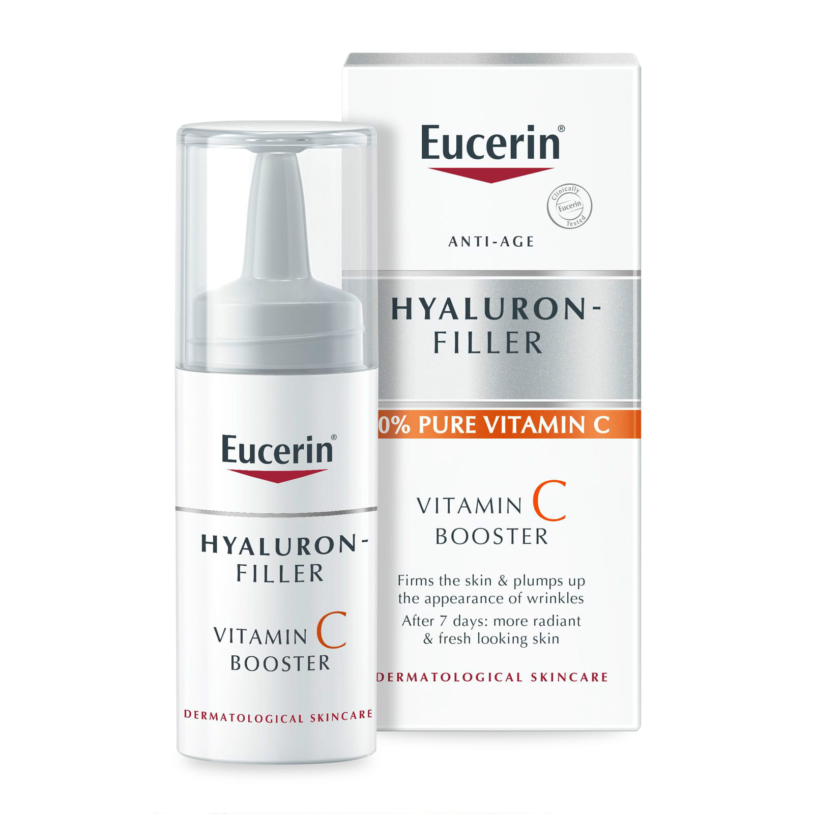 Eucerin Hyaluron Filler 10% Pure Vitamin C Booster is an anti-aging serum with 10% pure and freshly-activated Vitamin C for all skin types A fast-absorbing booster that strengthens and smooths skin while plumping up wrinkles Skin looks fresher and more radiant in just seven days