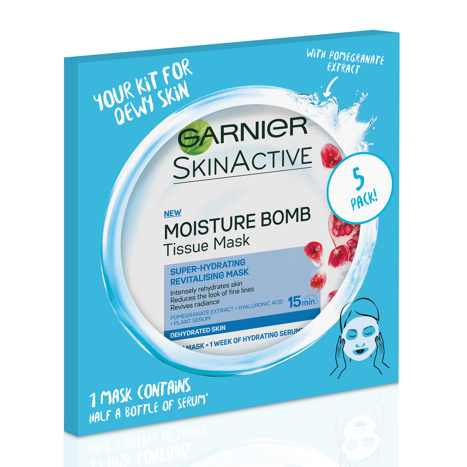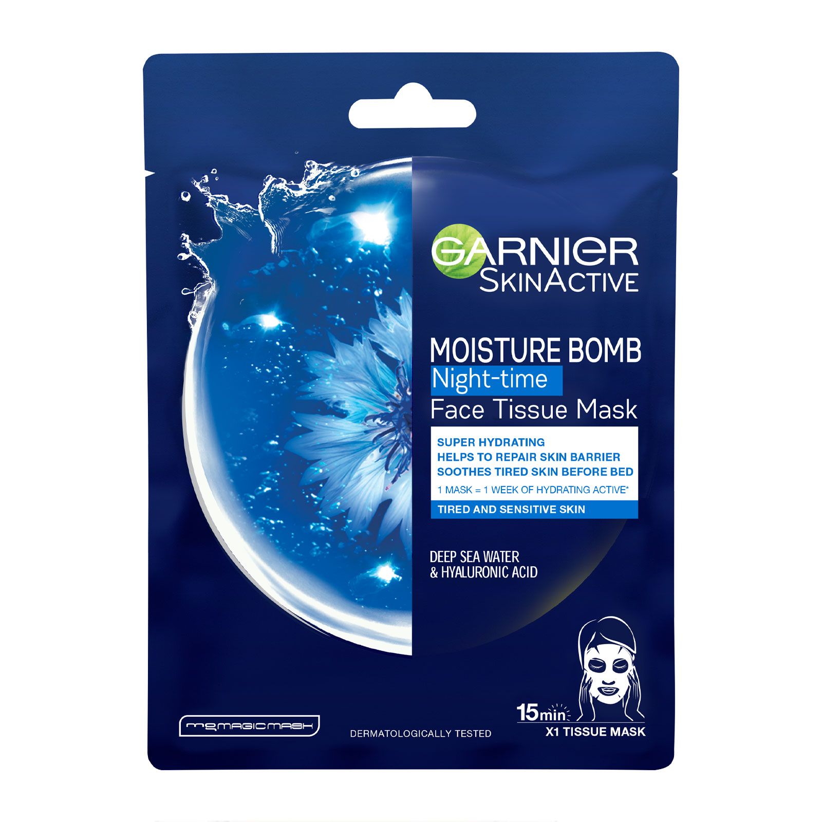 Super hydrating tissue mask to help repair skin barrier and soothe tired skin before bed Enriched with deep sea water and hyaluronic acid Is Garnier Moisture Bomb Night-time Tissue Mask right for me? Does your skin look tired & feel worn out? Need a relaxing and skin boosting treat? Take 15 minutes before sleeping to relax