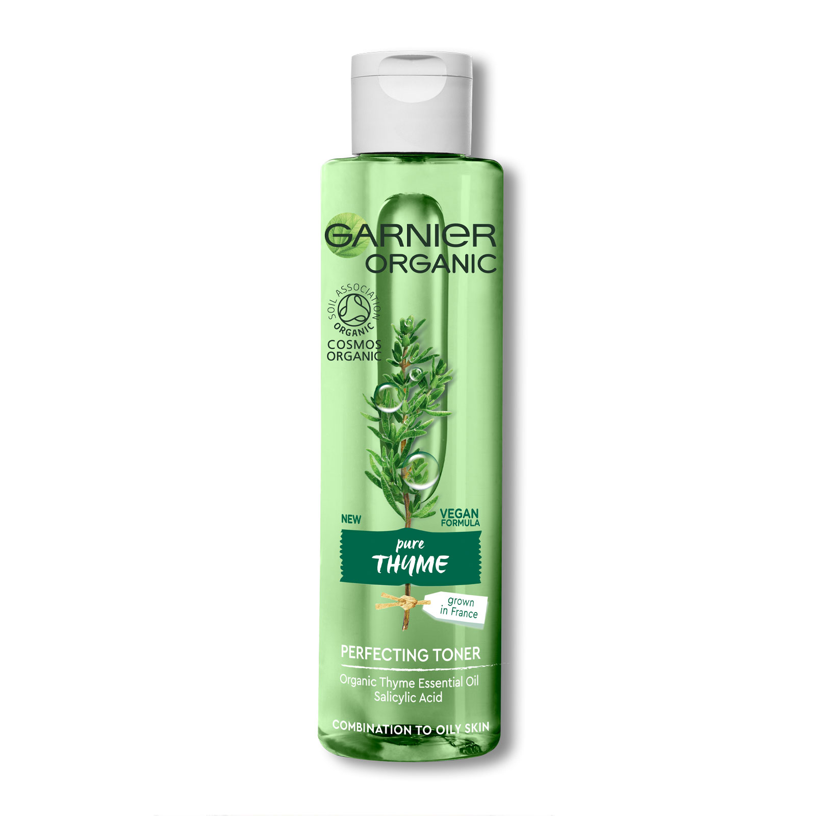 Discover the Garnier Organic Thyme Perfecting Toner formulated with Organic Thyme Essential Oil, Organic Barley Water and Salicylic Acid This daily use toner purifies and mattifies skin, making pores appear tightened and skin s texture appear refined 100% natural-origin fresh aromatic fragrance